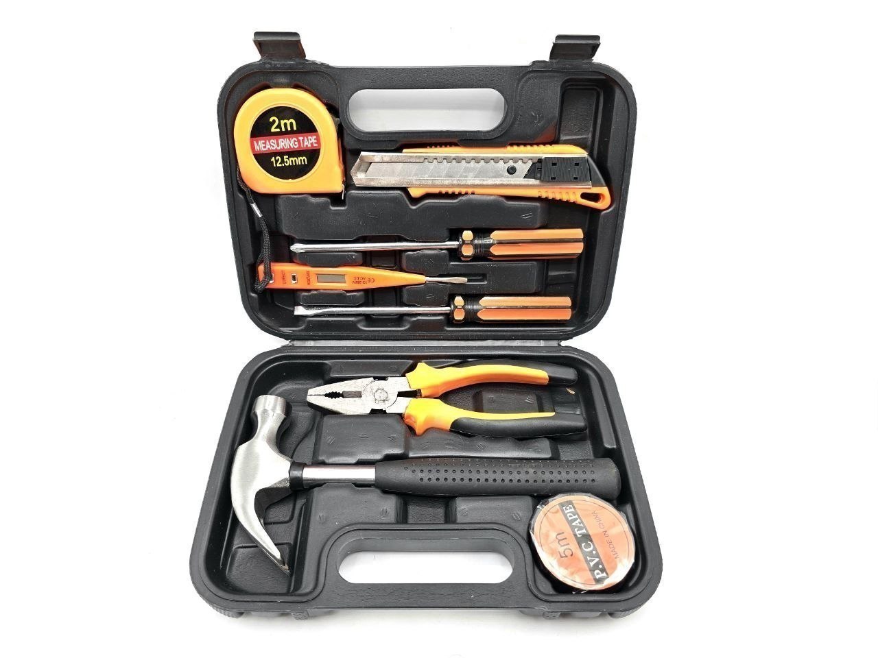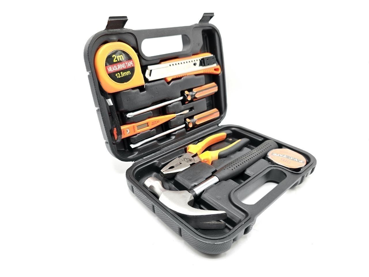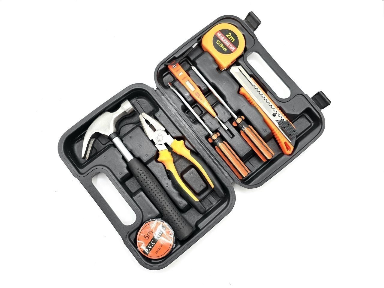 انبردست، چکش میخ کش، کاتر سایز بزرگ روکش دار، متر ۲ متری، پیچ گوشتی دوسو و چهارسو سایز بزرگ، چسب برق، فازمتر دیجیتال